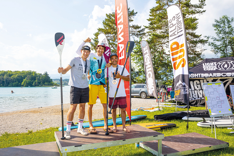 Drei Tage Sonne, Sommer und Sonnenschein am Faaker See, dem kürzlich Michael Kummerers MJK Sportmarketing GmbH dem SUP-Sport – ein nachhaltiger neuer Impulsgeber für die Region – eine breite Bühne gab. 500 Athleten aus Deutschland, Slowenien, Ungarn, aus der Ukraine und Österreich stellten sich den Herausforderungen über kurze und lange Distanzen. Den abschließenden TECH Race entschied Chris Taucher (Österreichs Meister) für sich (Bildmitte), flankiert von Bastian Grimm (links) und Hermann Husslein (beide Deutschland).