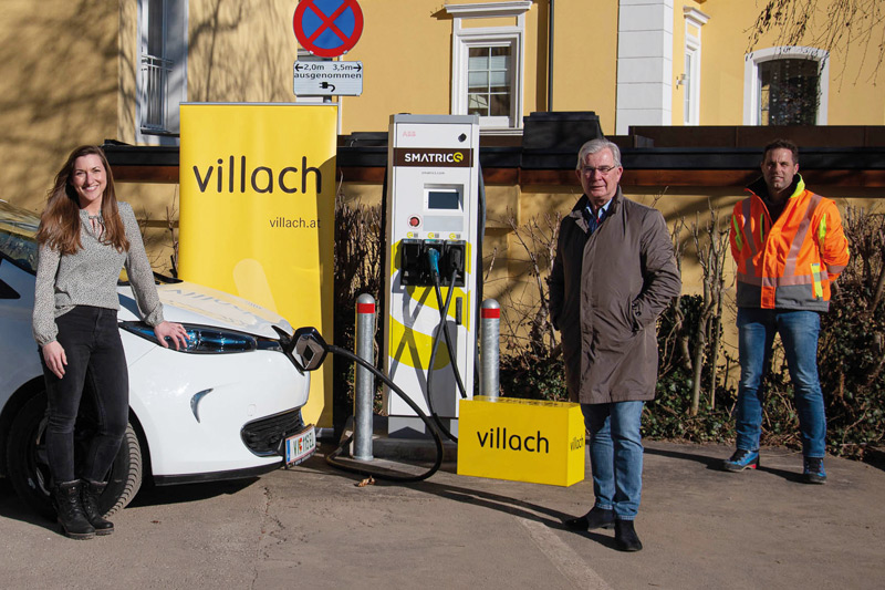Um den Einsatz von elektrobetriebenen Fahrzeugen zu forcieren, unterstützt die Stadt Villach ganz nach dem Motto „Villach – grenzenlos grün“ die Errichtung von entsprechender Infrastruktur in Form von E-Lademöglichkeiten. Gemeinsam mit der Firma SMATRICS EnBW GmbH werden in der Innenstadt in den nächsten zwei Jahren fünf Schnellladestationen für E-Autos installiert. Diese sollen 50 kW bis 300 kW Ladeleistung erreichen und damit kurze Ladezeiten der E-Fahrzeuge ermöglichen. Am Elite-Parkplatz in der Völkendorfer Straße steht schon die erste Station. Diese hat zwei Anschlüsse mit je 50 kW DC (Gleichstrom) und 43 kW AC (Wechselstrom). In diesen Tagen wird die zweite Ladestation (150 kW) gegenüber dem CCV realisiert. In weiterer Folge sollen auch an der Draulände bei der Markthalle, in der Nähe des LKH und bei der Stadthalle Ladestationen von SMATRICS entstehen. Elite-Parkplatz: Am Bild von links Simone Jungen (Städtische Betriebe), Stadtrat Harald Sobe und Christof Fischer (Wirtschaftshof), mit einem E-Fahrzeug der städtischen E-Flotte, das mit 50 kW geladen wird.