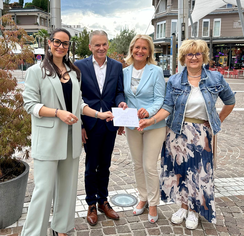Der neue Wirtestammtisch – mit seiner beherzten Initiatorin Renate Wrann – konnte heuer die Idee zum „1.Veldener Indian Summer Street Festival“ mit viel Livemusik, Straßenkunst und Kulinarik fulminant umsetzen. Ein köstliches Highlight war der 22 Meter lange Apfelstrudel, der von Elfi Wrann in insgesamt 18 Stunden gebacken worden war. Der Reinerlös von 1.900 Euro wurde an Bürgermeister Ferdinand Vouk für soziale Zwecke übergeben. Von links Desiree Strohmayer, Vouk, GR Dr. Margit Heissenberger und Adelheid Weritz.