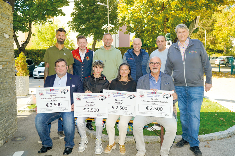 Ihr großes Herz für die Schwächeren unserer Gesellschaft stellte neuerlich ETK Elektro Tischner & Klein unter Beweis. Der Erlös aus dem Ausschank am Villacher Kirchtag – bereits zum vierten Mal – wurde sozialen Zwecken zugeführt. Hinten von links Hans Jörg Petrik (Beeftisch), Manuel Wielt­schnig (Junge Wernberger), Robert Seppele (Organisator), Andreas Klein (ETK), Wolfgang Tischner (EC Kellerberg), Rudolf Tischner (ETK); vorne von links BM Gerald Ebner (Arriach), Elias Fercher (Florians Bruder), Direktorin Orsola Caldera (VS Friedenspark) und BM Klaus Glanznig (Treffen).