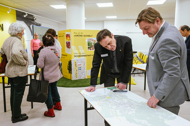 Viele Ideen für die Grünraumgestaltung. In persönlichen Gesprächen mit Bürgermeister Günther Albel und Planungsreferenten Stadtrat Harald Sobe mit Villacherinnen und Villacher flossen ebenfalls viele Ideen für die Grünraumgestaltung und ortsplanerische Anregungen. Sobe: „Sehr erfreulich, dass alle Teilnehmerinnen und Teilnehmer höchst motiviert sind, unsere Stadt noch nachhaltiger und noch grüner zu gestalten.“ Die Teilnehmenden waren inspiriert von der Kreativität und dem Ideenreichtum im „lebensRAUM“.