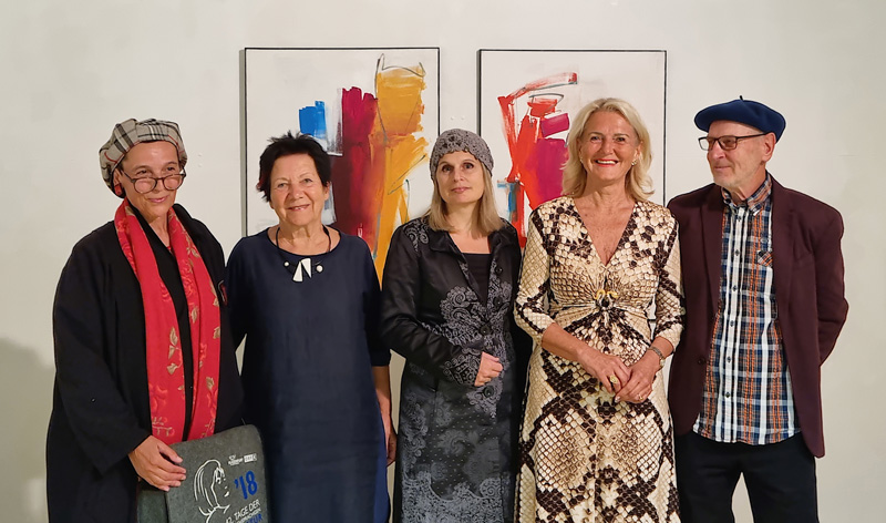 Im Rahmen der Reihe „curated by_station“ lud das Team Kunstbahnhof Wörthersee zur pop-up-Ausstellung EMOTION mit Arbeiten der „postWERK“-Mitglieder Arnold Kreuter und Inge Lasser. Nach den wertschätzenden Grußworten der neuen Veldner Kulturreferentin und langjährigen Gemeindevorständin Dr. Margit Heissenberger stellte Kuratorin Barbara Ambrusch-Rapp den zahlreich erschienenen Gästen die beiden Kunstschaffenden vor. Seit langer Zeit begibt sich die in Obervellach bei Hermagor lebende Crossover-Künstlerin Inge Lasser aus Begeisterung für die Texte von Ingeborg Bachmann auf malerische Spurensuche der bedeutendsten Kärntner Schriftstellerin des 20. Jahrhunderts, die heuer im Oktober vor 50 Jahren in Rom verstorben ist. Der Villacher Maler Arnold Kreuter zollte Bachmann seinen Tribut mit einem kontrastreichen Triptychon zur komplexen Beziehung der Schriftstellerin zu ihrem Kollegen Max Frisch. Auf dem Bild von links Literatin Claudia Rosenwirth-Fendre, Künstlerin Inge Lasser, Kuratorin Barbara Ambrusch-Rapp, Kulturreferentin Dr. Margit Heissenberger und Künstler Arnold Kreuter.