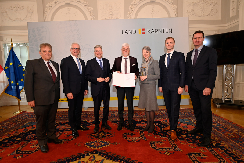 Kelag-Vorstand Manfred Freitag wurde mit einem der höchsten Berufstitel der Republik ausgezeichnet – „Baurat h. c.“ Landeshauptmann Peter Kaiser: „Als Top-Fachmann, Mensch und Freund hat er die Kelag zu einem modernen Energieunternehmen geführt.“ Freitag hat sich auch als Bauingenieur auf der Großbaustelle „Pumpspeicherkraftwerk Reißeck II“ einen Namen gemacht. Von links Gilbert Isep, LA-Präsident Reinhart Rohr, LH Kaiser, Manfred Freitag, LHStv.in Gaby Schaunig, Laudator Danny Güthlein und Kelag-Vorstand Reinhard Draxler.