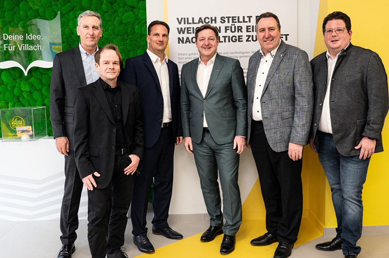 Vorgestellt: Mit der Errichtung des neuen „josefimarkts“ am Kaiser-Josef-Platz nützt die Stadt Villach eine Jahrhundertchance. Ab 2025 entstehen mit der gemeinnützigen Siedlungsgesellschaft ein Alpen-Adria-Genussmarkt und über der Halle bis zu 80 leistbare BWSG-Wohnungen. Am Bild von links die Architekten Christian Halm und Reinhard Tschinder (Architektur Consult), BWSG-Vorstand Mathias Moser, Bürgermeister Günther Albel sowie die Stadträte Erwin Baumann und Christian Pober während der Projektvorstellung.