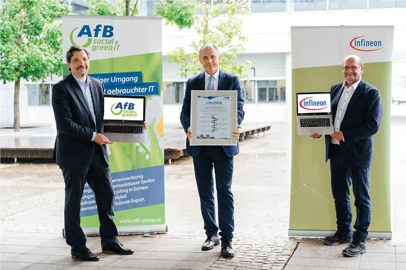 Durch die Kooperation mit der gemeinnützigen AfB „Arbeit für Menschen mit Behinderung“ bekommen die gebrauchten IT-Geräte von Infineon ein zweites Leben und tragen zum Klimaschutz bei: Im Jahr 2020 wurden über 183.000 Kilogramm Rohstoffe eingespart und zwei Arbeitsplätze mit Inklusion gesichert. „Als Leitbetrieb ist es uns ein Anliegen, Technologie, Umwelt und Gesellschaft nachhaltig miteinander zu verbinden“, freut sich Infineon-Austria-Finanzvorstand Oliver Heinrich (Mitte), flankiert von Fabio Papini (AfB) und Infineon-Zentralbetriebsrat Robert Müllneritsch (rechts).
